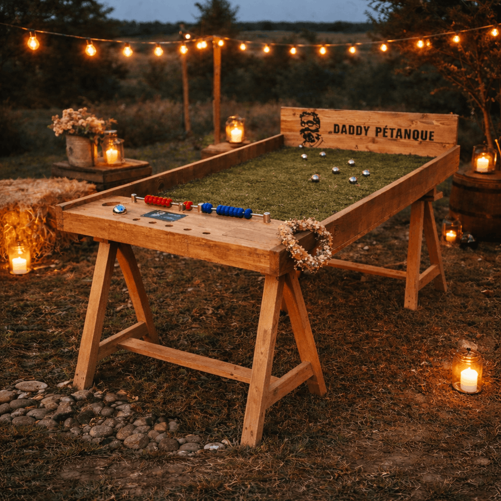 Il s'agit d'un mini terrain de pétanque réalisé en France sur notre atelier de La Rochelle. Parfait pour jouer avec vos amis lors de vos soirées entre collègues, en famille ou sur vos événements, ce terrain de pétanque se transporte facilement & s'installe en 30 secondes sans contrainte d'espace. Elle ne demande aucun outil pour le montage.