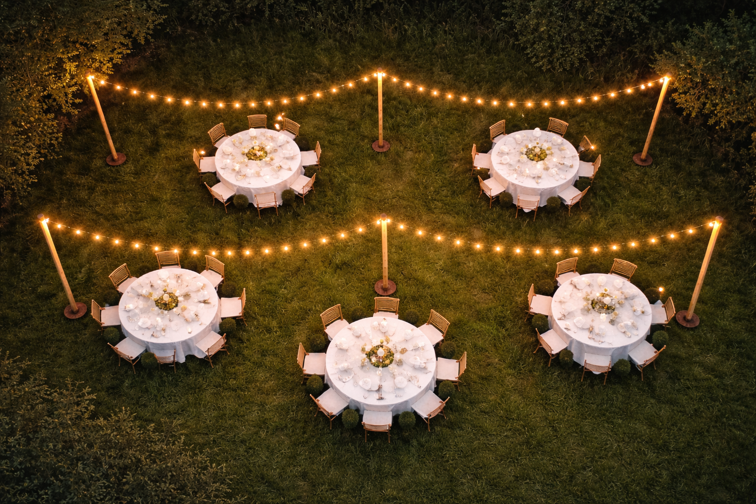 Deux guirlandes de 10 mètres sont incluses dans le pack. Elles offrent la possibilité d’installer deux lignes lumineuses de 10 m, parfaites pour surplomber de longues tables de banquet, un buffet, un espace cocktail ou encore une piste de danse. Le rendu visuel est immédiat : la lumière chaude enveloppe l’espace et transforme instantanément l’ambiance, de jour comme de nuit.