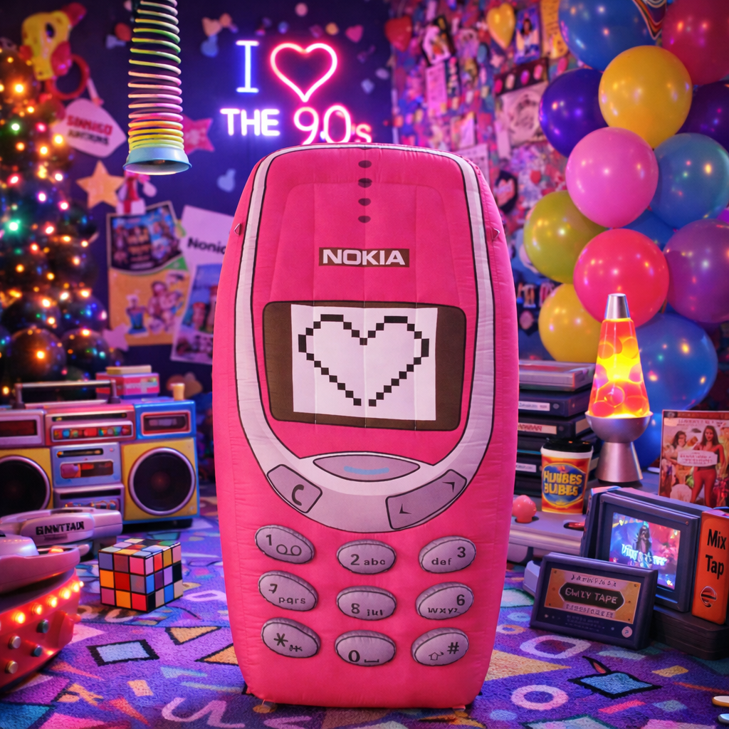 Icône absolue des années 2000, le Nokia 3310 fait son grand retour… dans un format totalement démesuré et résolument festif. Avec ses 3 mètres de hauteur, ce téléphone portable rose gonflable attire immédiatement le regard et plonge petits et grands dans une vague de nostalgie joyeuse. Disponible à la location en prestation clé en main par SR EVENEMENTS, il peut être livré partout en France, pour tous types d’événements.