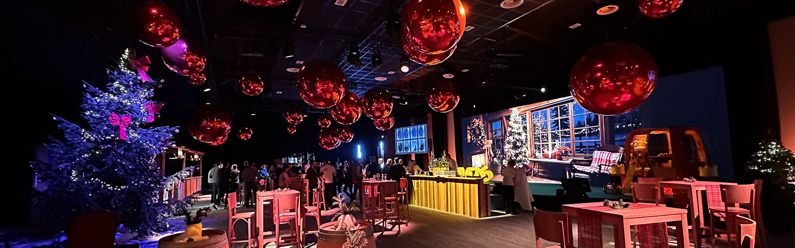 Pour créer cette ambiance chaleureuse et festive, SR Événements a mis en place des éléments décoratifs grandioses. Le plafond de la salle était orné de sphères gonflables et de ballons miroirs de tailles variées, allant de 60 cm à 150 cm. Ces éléments reflétaient la lumière de manière à créer un jeu scintillant, rappelant les flocons de neige et les étoiles de Noël.