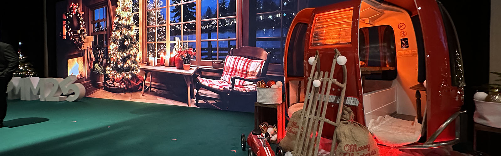 L’élément phare de la scénographie était une télécabine rouge, symbole d’évasion et de magie hivernale. Placée au centre de l’installation, elle invitait les invités à se plonger dans l’esprit montagnard et festif des fêtes de Noël. La télécabine était également un formidable point photo, parfait pour immortaliser cette soirée unique.