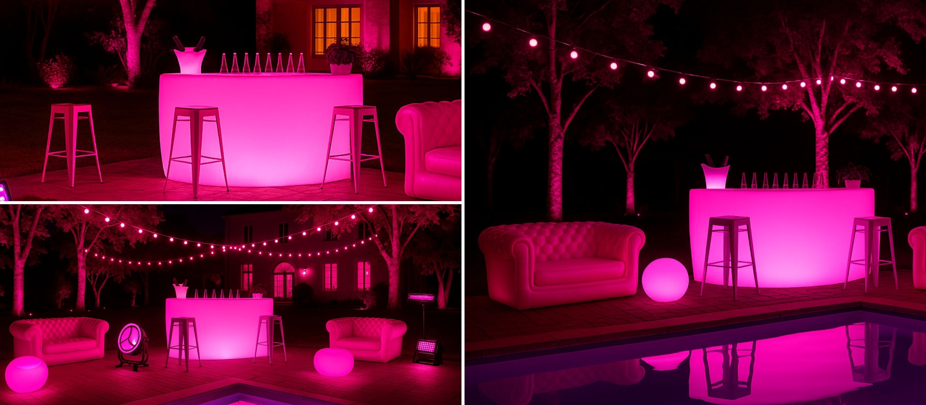 💗 Éclairage et décoration : projecteurs roses, colonnes roses, ballons miroir rose