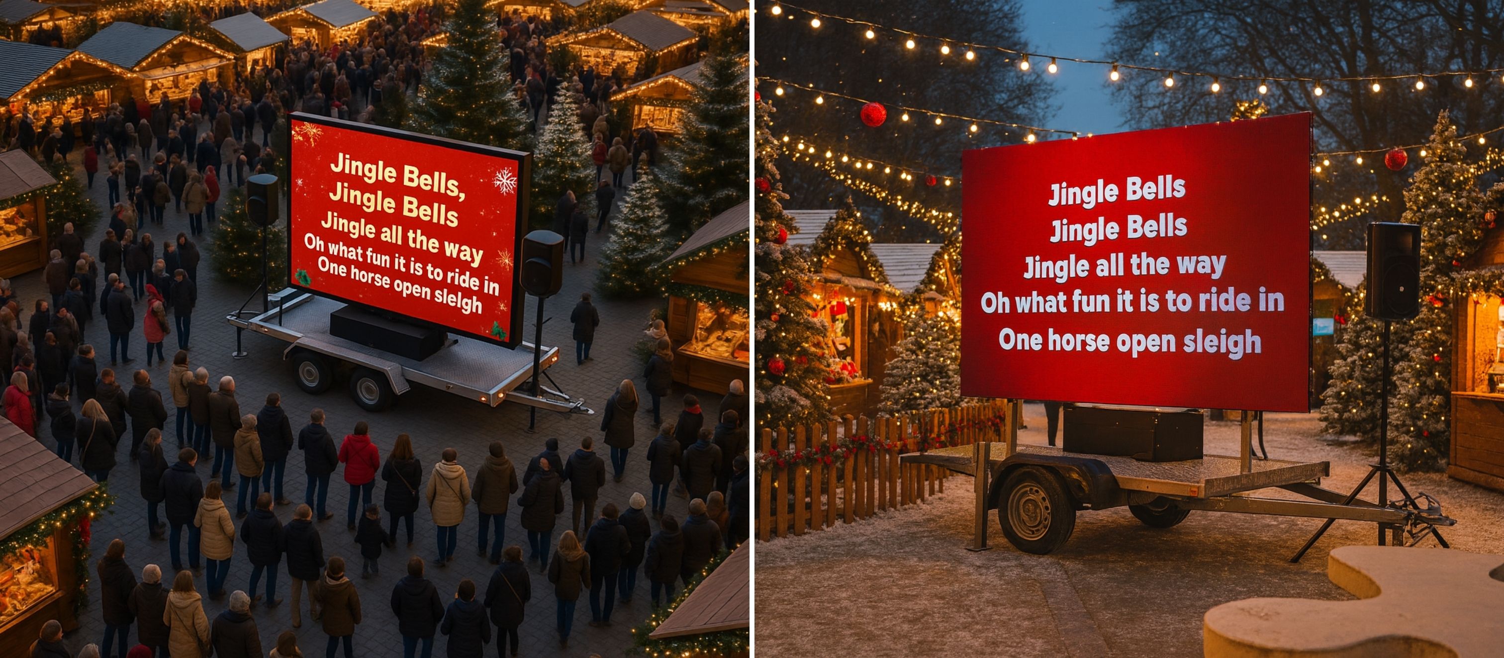 Facile à installer et entièrement autonome, notre écran géant sur remorque s’adapte à tous les lieux : centre-ville, place du marché, parking ou cour intérieure. En quelques minutes seulement, votre marché de Noël prend une toute nouvelle dimension visuelle et sonore.