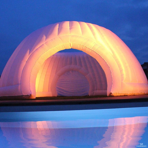 Bénéficiant de deux entrées arrondies en face à face, ce panoramic design, blanc et gonflable vous donne l'opportunité de circuler avec fluidité. Des bâches opaques blanches sont toutefois possibles à installer facilement grâce à un zip de fermeture.