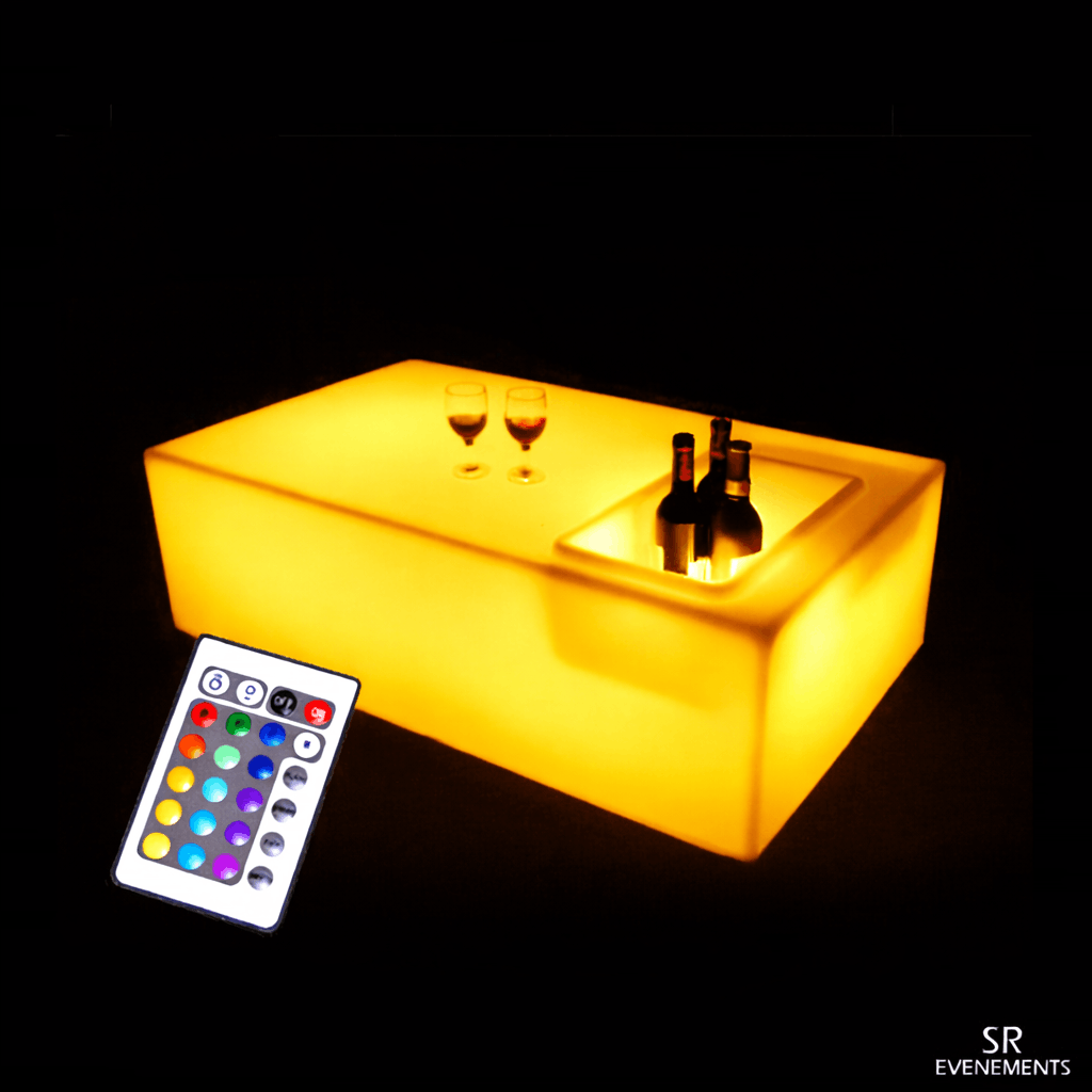 SR Événéments dispose d'un large panel de produits lumineux autonomes et étanches qui peuvent aussi bien être utilisés en intérieur qu’en extérieur. L’ensemble de ces produits fonctionne avec une télécommande infrarouge qui permet de sélectionner plusieurs programmes ou de choisir une couleur fixe. Ce type de mobilier propose un large choix de couleurs : jaune, orange, rouge, rose, violet, bleu, vert, blanc, … et permet de faire des fondus entre les couleurs plus ou moins rapides, ce qui en fait un produit phare pour les soirées zen par exemple.