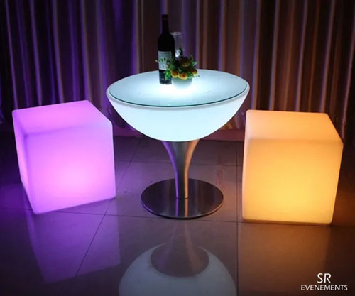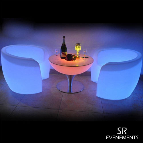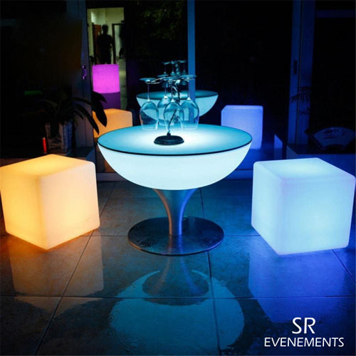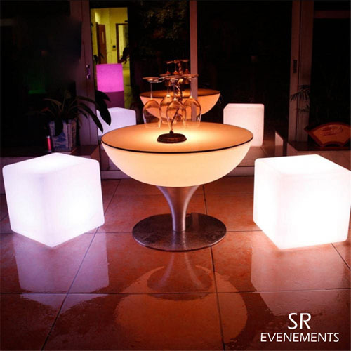 D'une hauteur de 45 cm cette table basse lumineuse sur batterie se pilote avec une télécommande IRC :  idéal comme table de salon, pour un séjour à l'ambiance chaleureuse ou dans un bar branché ou un espace Vip sur un festival