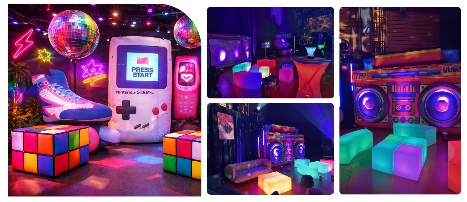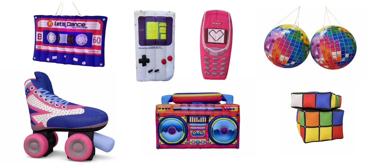 Les années 90 sont synonymes de pop culture, de couleurs flashy et d’objets cultes. Pour recréer fidèlement cette atmosphère, nous proposons une large gamme de décors gonflables XXL emblématiques :